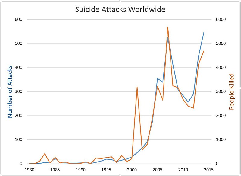 Between 1981 and 2015, over 4,800 suicide attacks occurred in over 40 countries, killing an estimated 45,000 people.