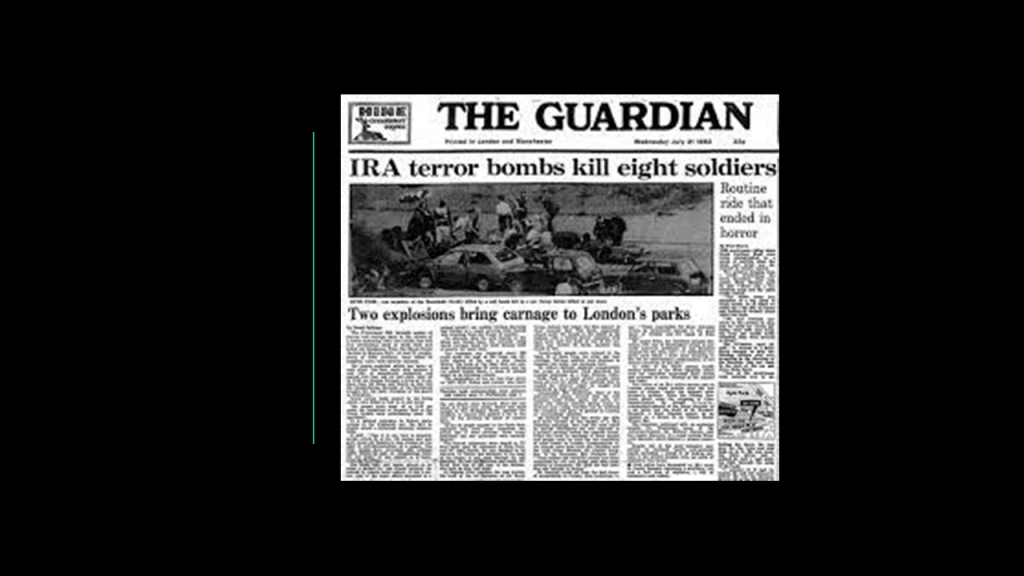 On July 20th, the Provisional Irish Republican Army (IRA) detonated two bombs in Central London, one in Hyde Park, and the other in Regent’s Park, killing 8 soldiers, wounding 47 people and killing 7 horses.