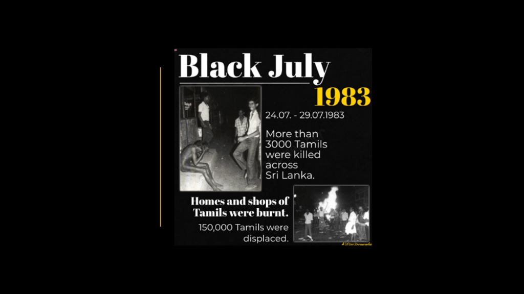 Over a period of 7 days in what is known as “Black July,” mobs attacked, burned, looted and killed Tamil targets, with a death toll with a death toll estimated at over 3,500, and their homes and shops destroyed.
