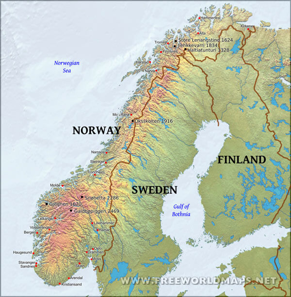 The highest peak in Norway is Galdhopiggen, southwest of Trondheim.