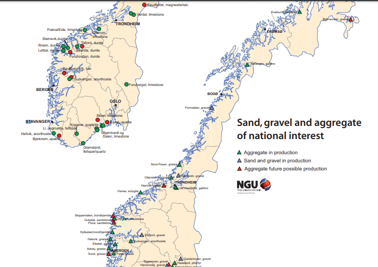 In the area surrounding Trondheim today, the active mining is primarily for limestone and aggregate, which is a broad category of coarse- to medium-grained particulate matter used in construction in the form of sand, gravel, and crushed stone.