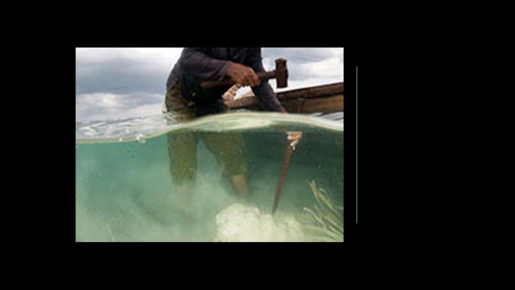 Coral mining can take place anywhere coral is available in a convenient location, usually occurring at low tide, and is done by either using dynamite…or iron bars to manually to retrieve the coral by breaking-up the larger corals into smaller pieces that can easily be carried to shore.