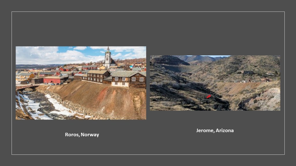 Rich deposits of copper ore were discovered here, which was said to have led to a golden age for the community in the 18th-century on the left, compared for similarity in appearance on the right with Jerome, an old copper mining town in Arizona.