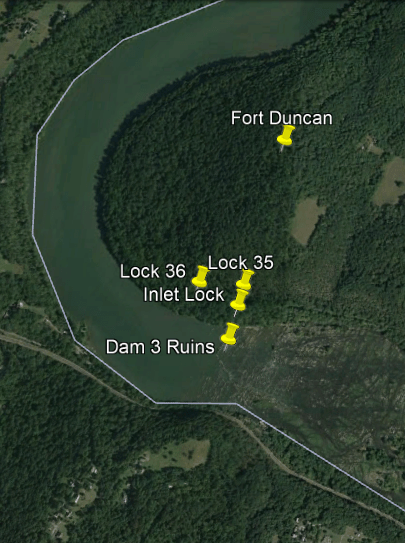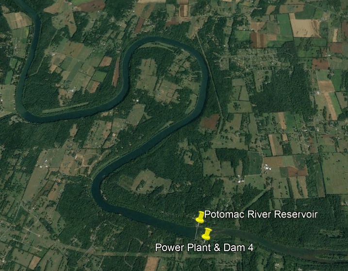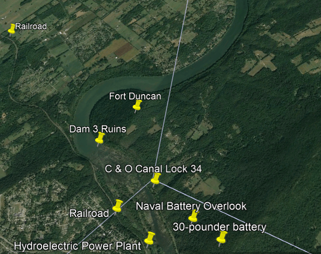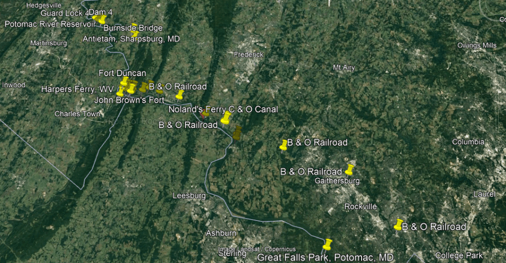 Here is a Google Earth Screenshot along the Potomac River between Great Falls Park in Potomac, Maryland, showing all the infrastructure that is found along here in-between there and the Potomac River Reservoir north going through Harper’s Ferry, including the C & O Canal, the B & O Railroad, bridges, aqueducts, reservoirs, forts and batteries.