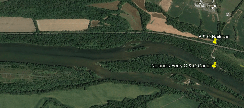 The first two pins down at the bottom of the screen show the relationship and distance at the locations between the Potomac River, Great Falls and the C & O canal, and where the B & O Railroad today makes its way through Montgomery county.