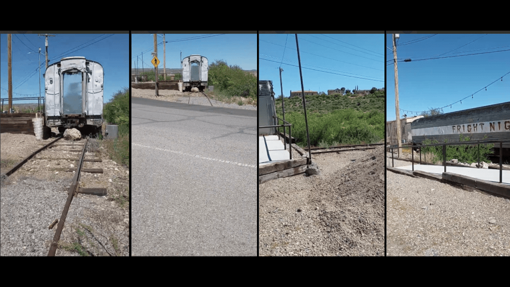 Facing in the opposite direction, there are some ratty-looking old train cars on an abandoned rail-line in front of the Verde Canyon Railroad Depot in Clarkdale, surrounded by utility poles.