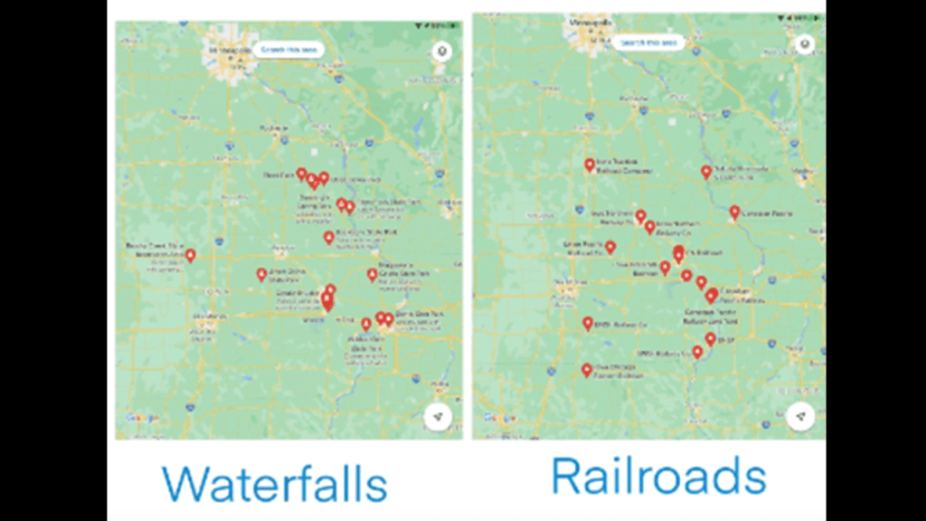 I looked for correlations between the state parks with waterfalls and railroads starting here at the upper section of the previous Google Earth screenshot.