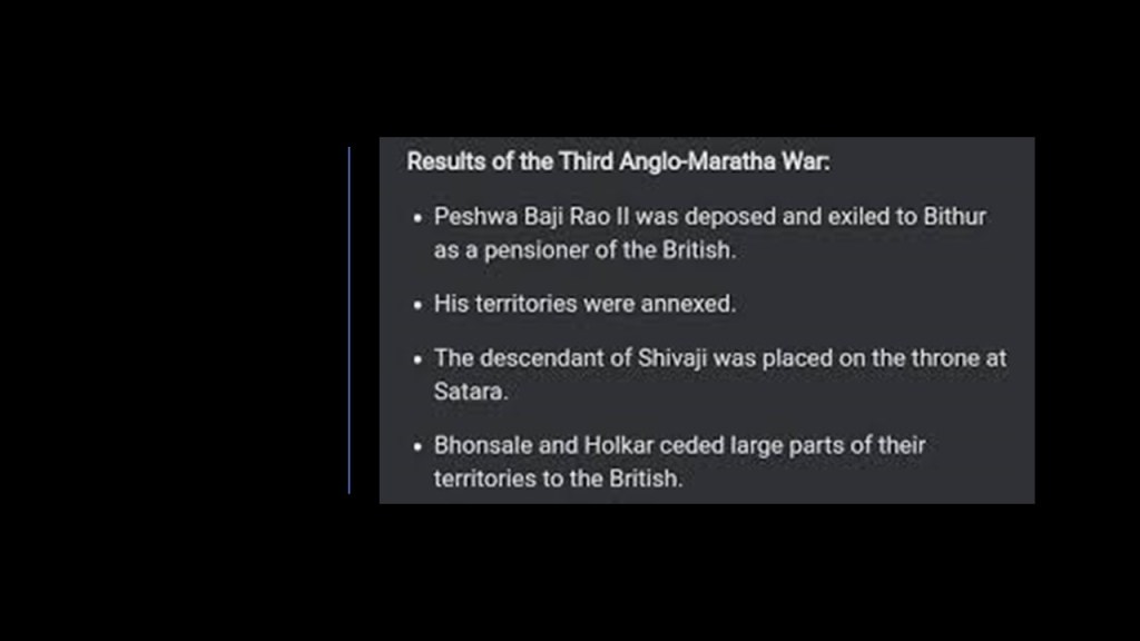 British victories were swift and by the end of the war, the British East India Company had taken control, in one form or another, including annexation to the Bombay Presidency in some cases, all of the Maratha Territories.