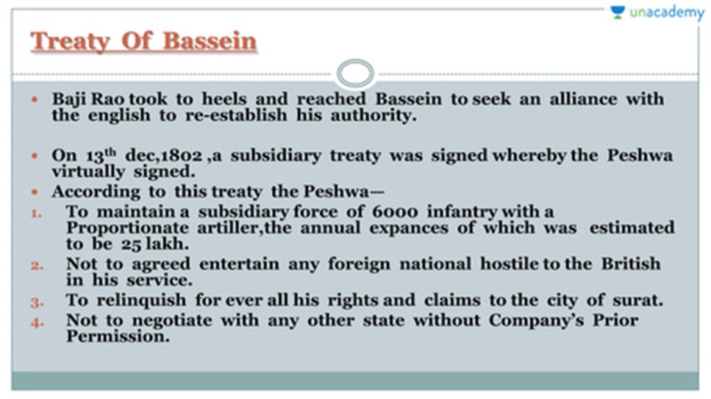 Baji Rao II signed the Treaty of Bassein with the British East India Company in which he ceded land for the maintenance of a subsidiary force and agreed to make no treaties with any other power.