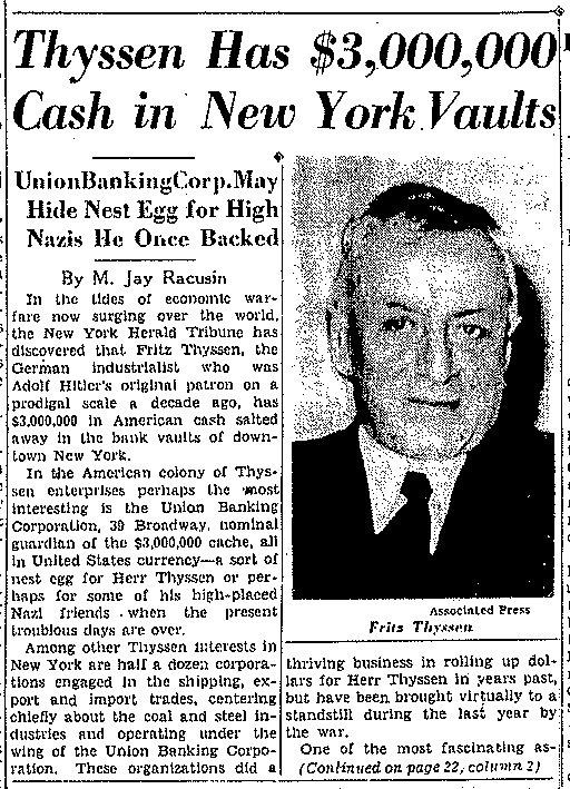 Also along with Prescott Bush, Bunny Harriman was one of the seven directors of the Union Banking Corporation, which financed Fritz Thyssen, a donor to the Nazi Party, and whose assets were seized by the United State government during World War II under the “Trading with the Enemy Act.”