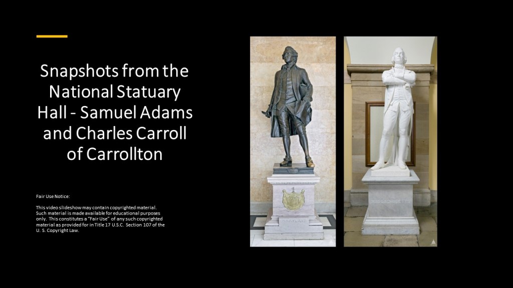 In this post, I am pairing Samuel Adams, who is in the National Statuary Hall for Massachusetts, who was an American statesman, politician, Founding Father of the United States, and Charles Carroll of Carrollton, who represents the State of Maryland, and was an Irish-American politician, planter, the only Catholic signer of the Declaration of Independence, and also considered a Founding Father.