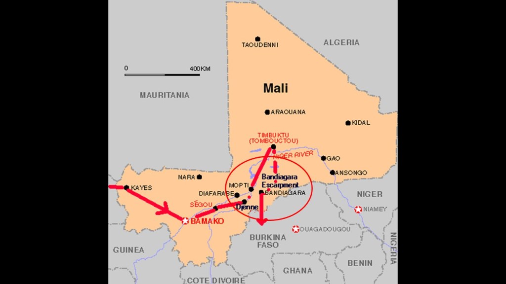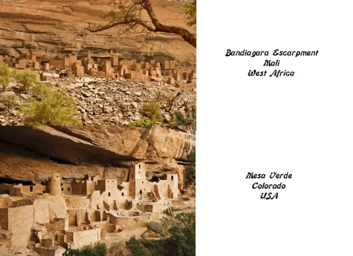 This is the Bandiagara Escarpment on the top, looking remarkably like Mesa Verde in the U. S. State of Colorado, on the bottom.