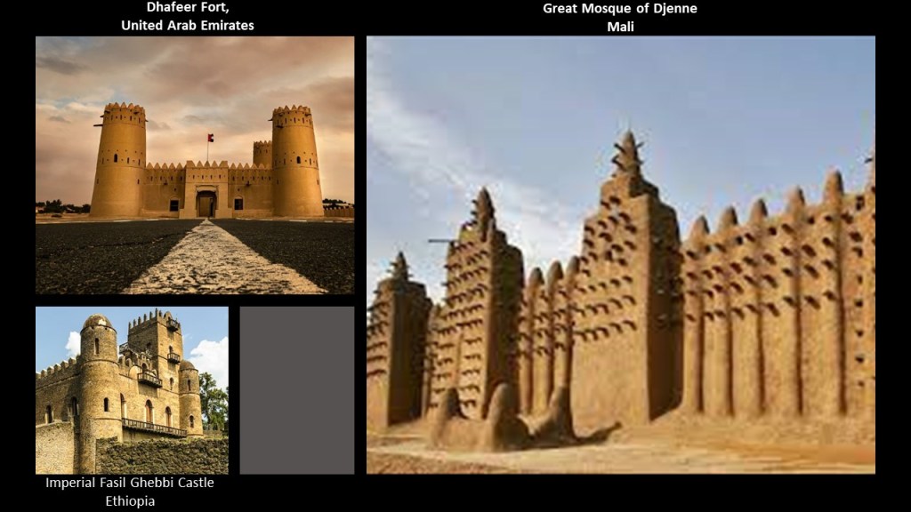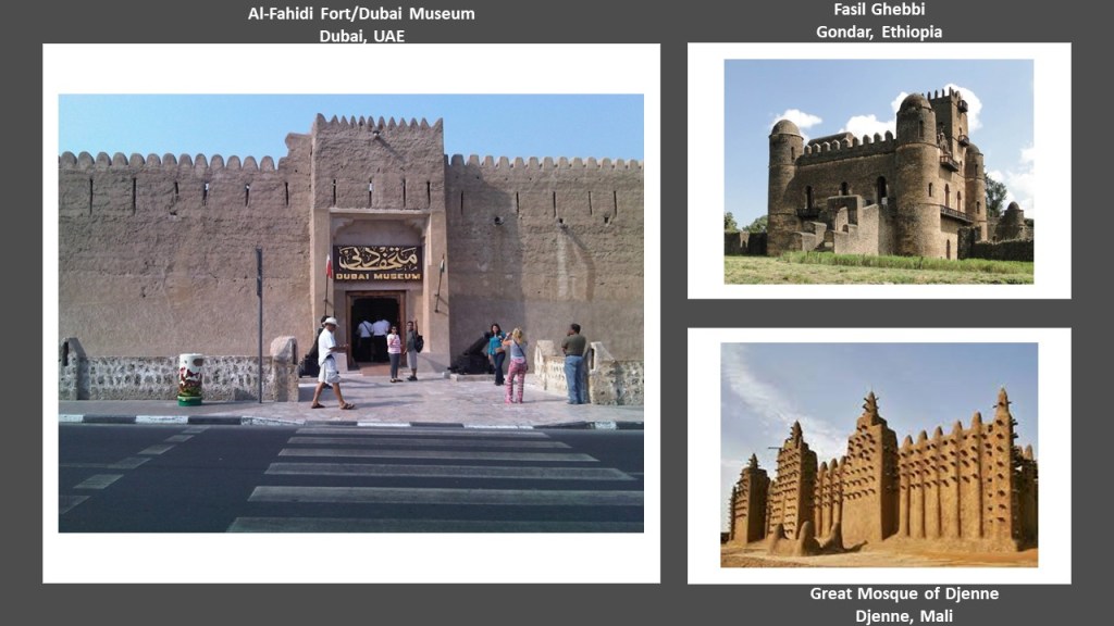 The Al-Fahidi Fort has the same architectural features shown previously in this post as the Fasil Ghebbi in Gondar, Ethiopia, the home of Ethiopia’s Emperors, on the top right, and the Great Mosque of Djenne in Mali in west Africa on the bottom right.