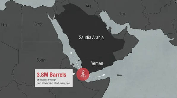 Next, we come to the Bab-el-Mandeb Strait, located between southwestern Yemen near Aden, and northeastern Djibouti, and connects the Gulf of Aden to the Red Sea.