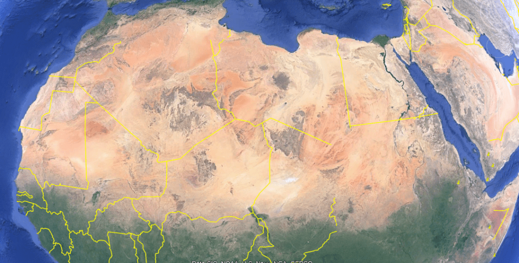Here is a Google Earth screenshot of the Sahara Desert today from the western coast of North Africa, across to the eastern coast.