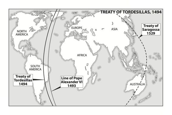 Thirty-five-years later, the Treaty of Zaragoza was signed, which specified the Antimeridian to the line of demarcation specified by the Treaty of Tordesillas, defining the areas of Spanish and Portuguese influence in Asia, and used as the means to justify the colonize the world by the Spanish and Portuguese.