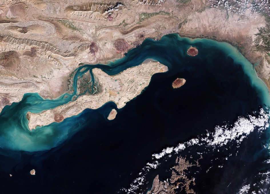 Next, the island of Hengam is located just south of Qeshm, holding the position of what looks like a flipper that broke off from the main body of the dolphin-shaped island.