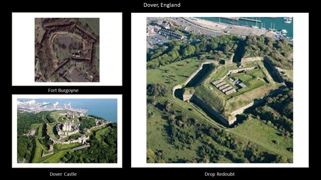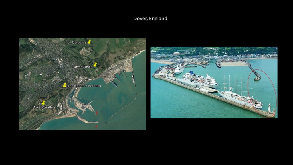 I found the same configuration of lighthouses at the entrance to the Port of Dover, England, in the English Channel, which has several fortifications nearby, like the sprawling Dover Castle; Drop Redoubt Fortress; and Fort Burgoyne.