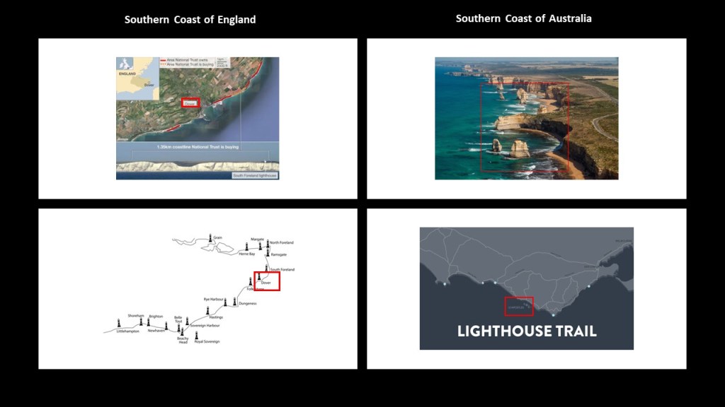 On the left-side is the rugged coast of southern England, where the “White Cliffs of Dover” are located, and a map showing corresponding lighthouses locations along the coast, and on the right side is a picture of the cliffs along the coast of Victoria State in southern Australia, where the Great Ocean Road passes by the 12 Apostles and the corresponding lighthouses beside the cliff-edge there.