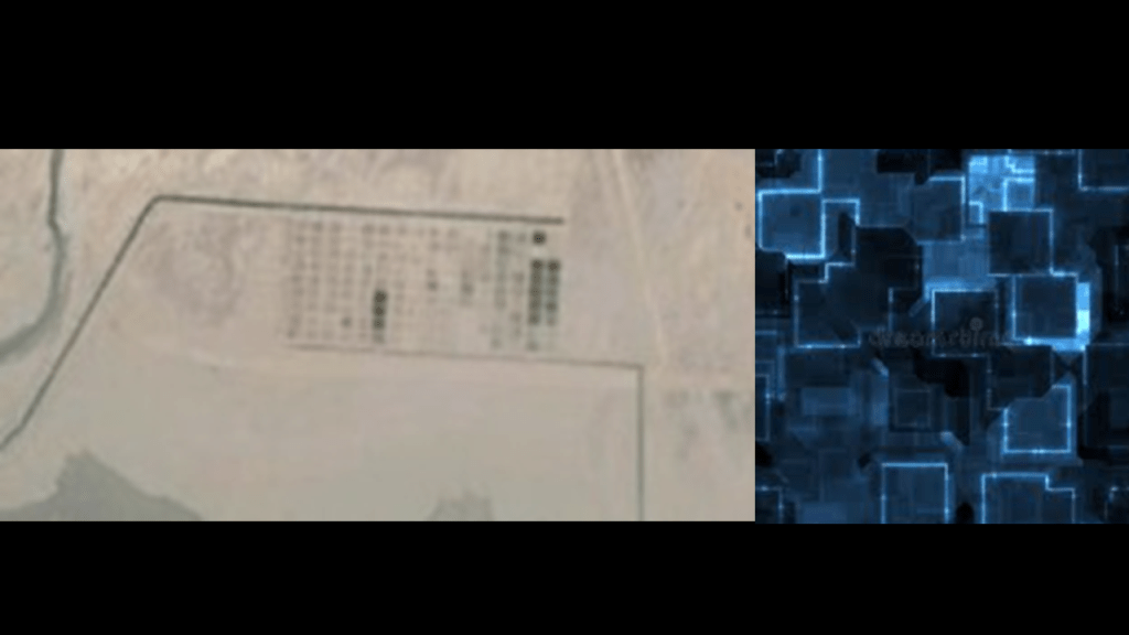 …there does appear to be an intentional configuration of many square shapes in the desert in that location in a close-up shot on the left that are reminiscent of circuitry chips on a circuit board on the right.