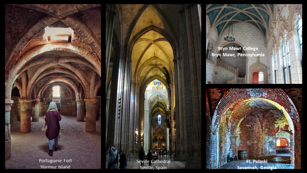 Here is a photo of the vaulted arches of the Portuguese fort on Hormuz on the left; compared with the vaulted arches of the Seville Cathedral in the capital of Moorish Spain, in the middle; and on the top right is the “Spanish Gothic” architecture at Bryn Mawr College in PA that was torn down about 15-years ago, with its vaulted ceiling, and five-lobed Moorish arches; and the vaulted archways at Ft. Pulaski in Savannah, Georgia, on the bottom right.