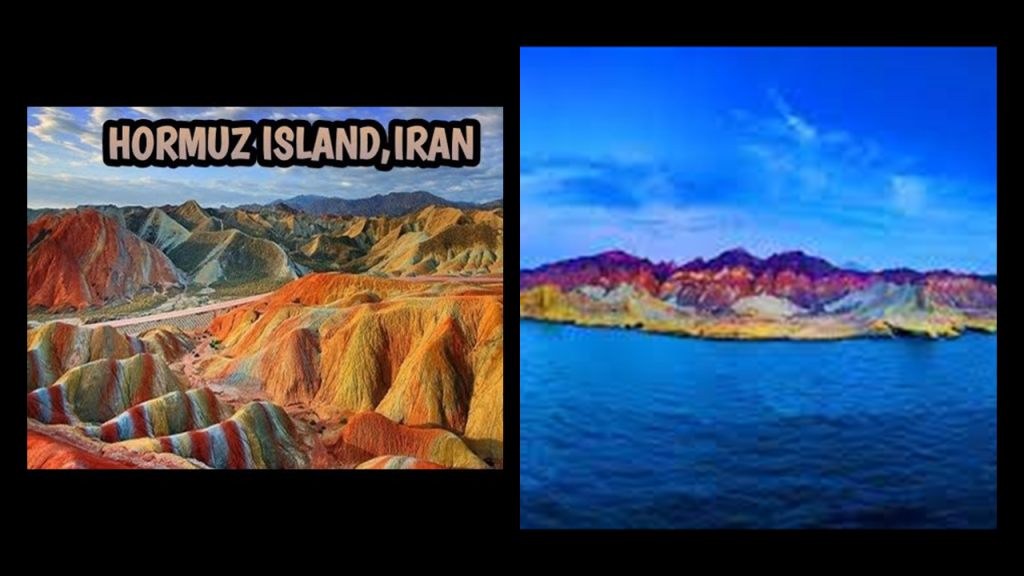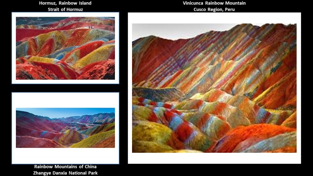 It is interesting to note that note that other places in the world that have rainbow colors similar to Hormuz Island on the top left include, Vinicunca, the rainbow mountain in the Cusco region of Peru on the right, and the Rainbow Mountains in the Zhangye Danxia National Park in China on the bottom left.