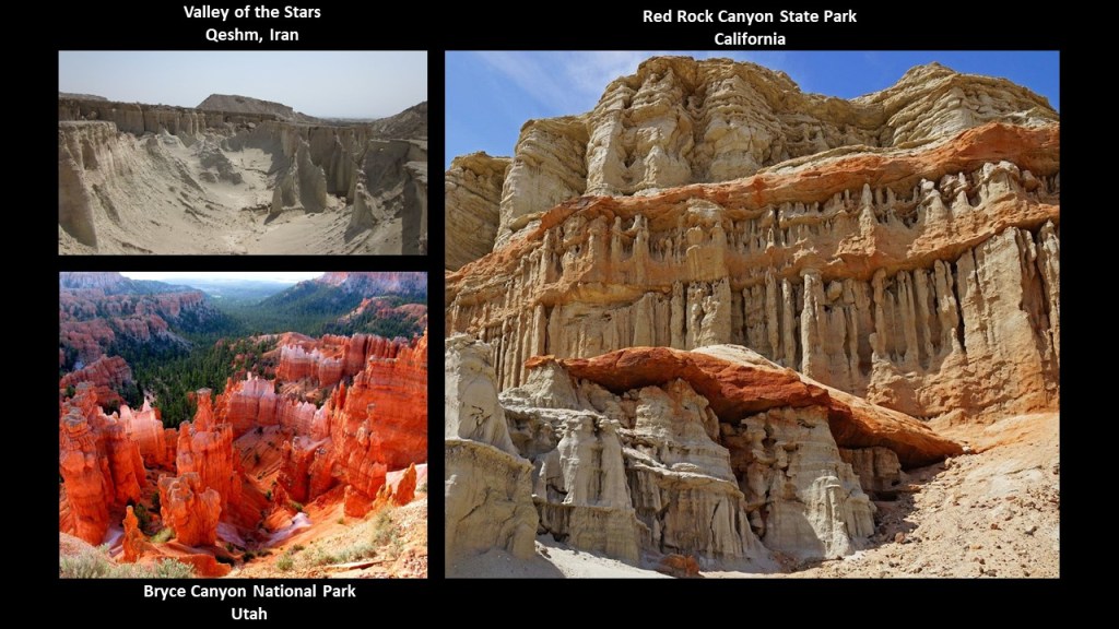 This view of the Valley of the Stars on Qeshm Island on the top left has a similar appearance to what’s found at Bryce Canyon National Park in Utah on the bottom left, and to Red Rock State Park in California on the right.