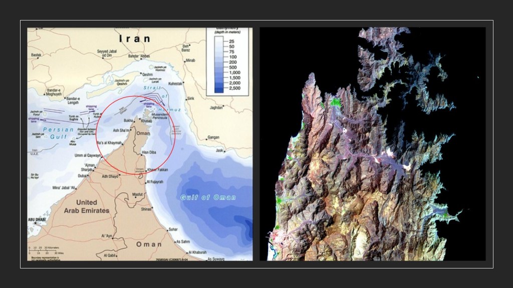 The Musandam Peninsula is on the the south coast of the Strait of Hormuz, and Iran is on the north coast of it.