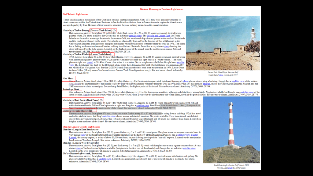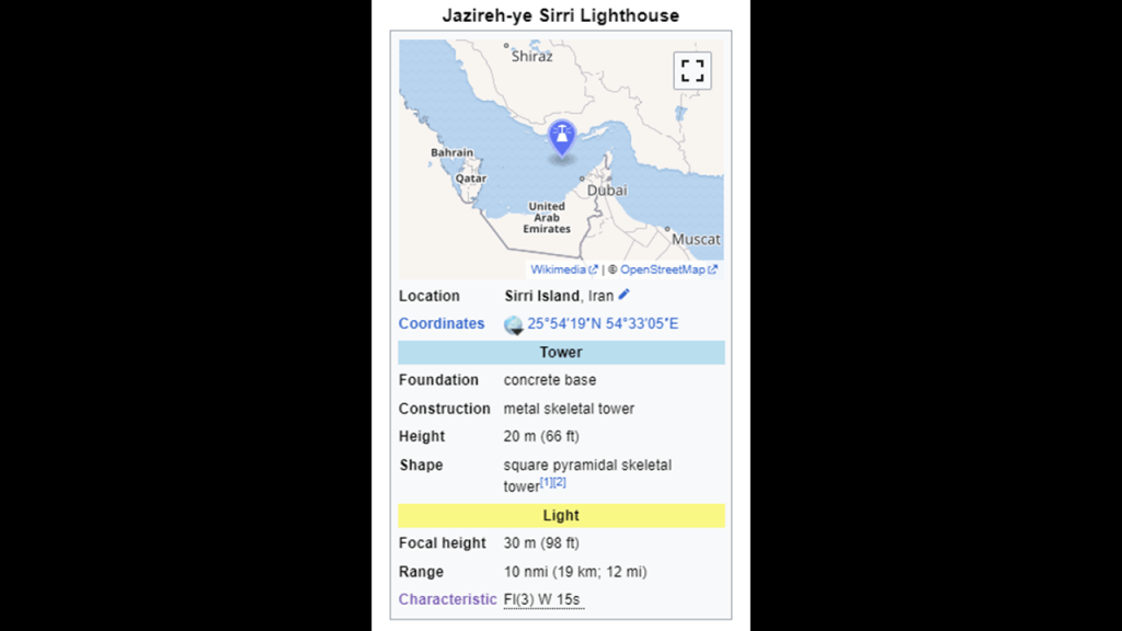 I saw where Sirri Island has a lighthouse, called the “Jazireh-ye Sirri” Lighthouse, but I was unable to find a picture of it.