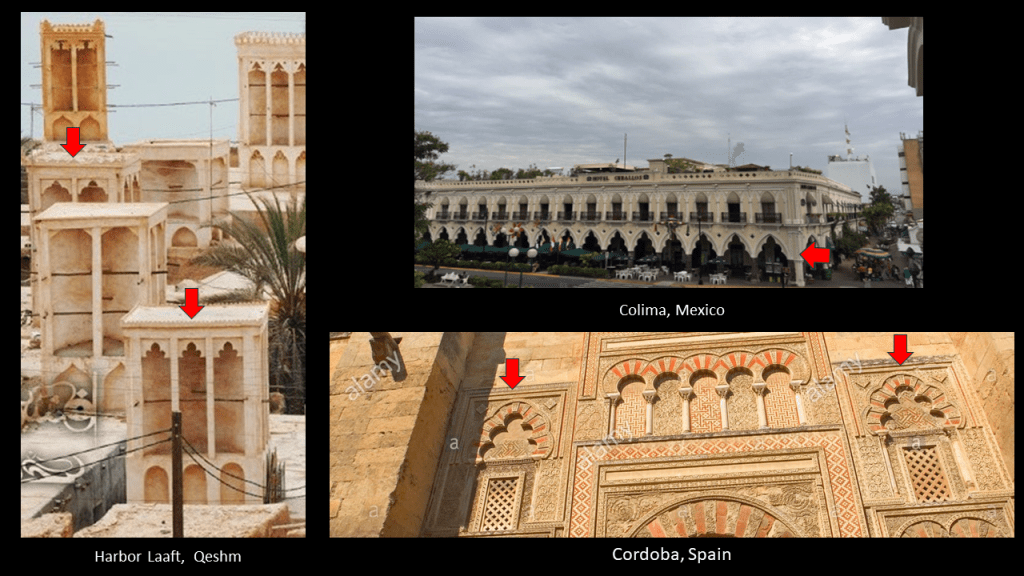 To support what I am saying, here are photos of five-lobed Moorish arches in Harbor Laaft on Qeshm on the top left; the Hotel Ceballos in Colima, Mexico on the top right, and of five-lobed arches in Cordoba, Spain, which is acknowledged Moorish architecture, the bottom right.