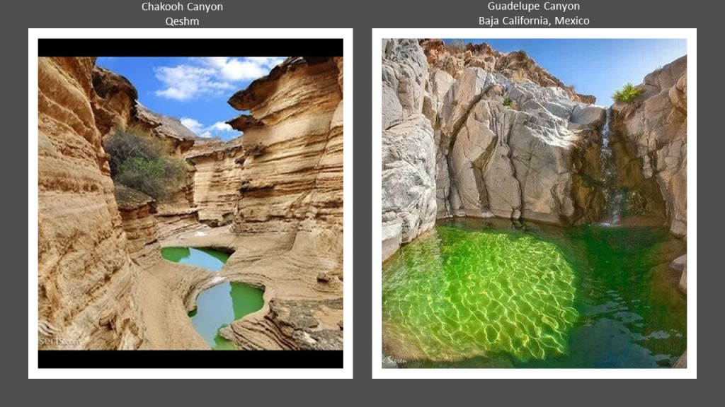 The color of the water in this view of Chakooh Canyon location on Qeshm Island on the left reminded me of the Emerald Pool in Guadelupe Canyon in Baja California, Mexico, on the right, a place that I found tracking a different long-distance alignment.