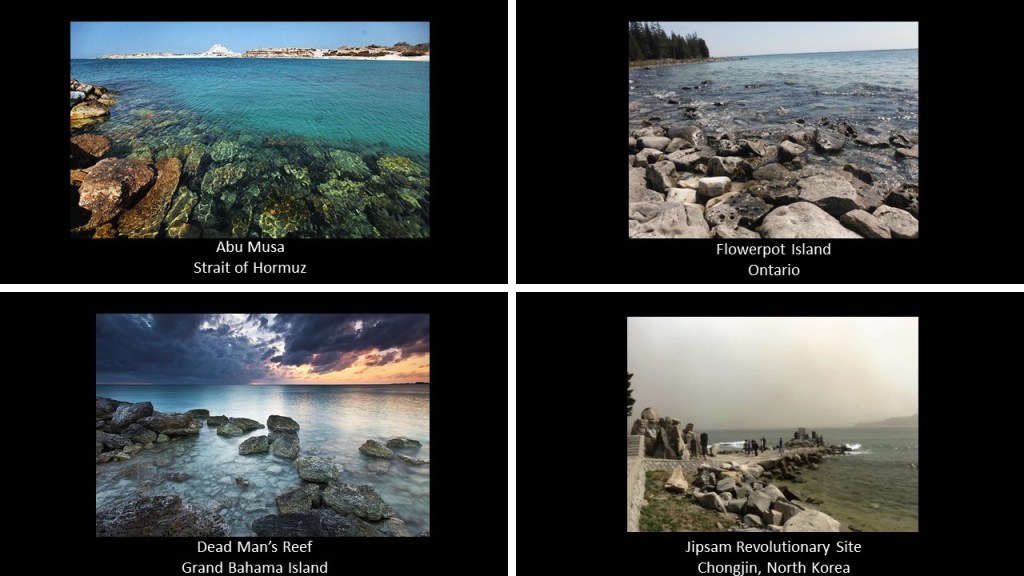 How about this comparison of the rocks on the shore of Abu Musa on the top left with the shore of Flowerpot Island, an island in Georgian Bay in the Province of Ontario on the top right; on the bottom left, Deadman’s Reef on Bahama Beach, located at West End on the Grand Bahama Island, and on the bottom right, at the Jipsam Revolutionary Site in Chongjin, North Korea.