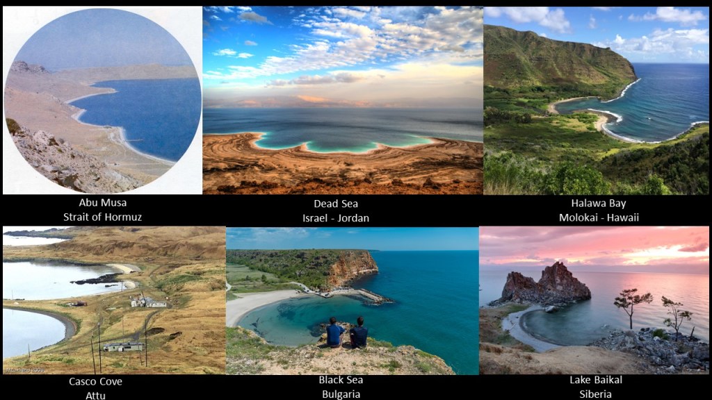 First, it has beaches with a symmetric curvature, as seen in this photo of Abu Musa on the top left, are features found in diverse places, like the Dead Sea in the top middle, which is located between Israel and Jordan; Halawa Bay on the top right, on the Hawaiian Island of Molokai; .Casco Cove on the island of Attu in the far-western part of the Aleutian Islands, on the bottom left; the Black Sea in Bulgaria, on the bottom middle; and and Lake Baikal in Siberia, on the bottom right.