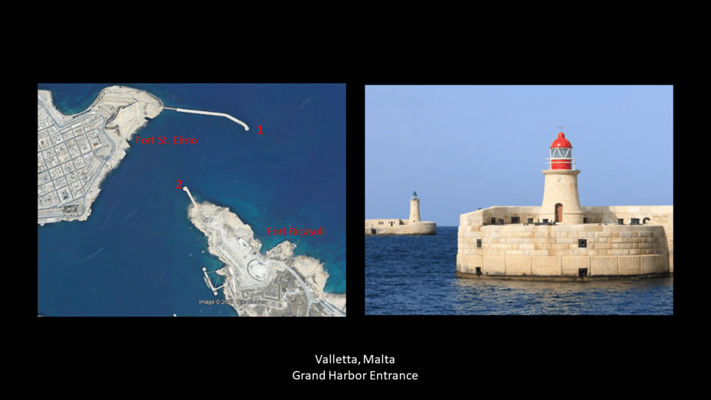 Other places I have found where lighthouses are located at harbor/port entrances in a similar configuration as Qeshm are at the Grand Harbor in Valletta, Malta, with Fort St. Elmo on one side, and Fort Ricasoli on the other…