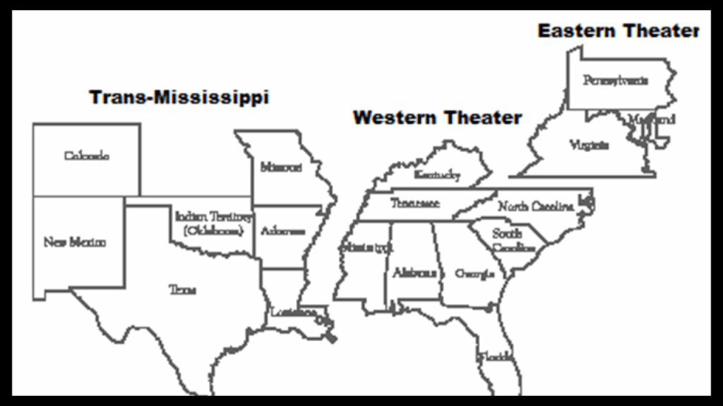 We are told there were three theaters of war during years of American Civil War, between 1861 and 1865: Eastern, Western, and Trans-Mississippi.