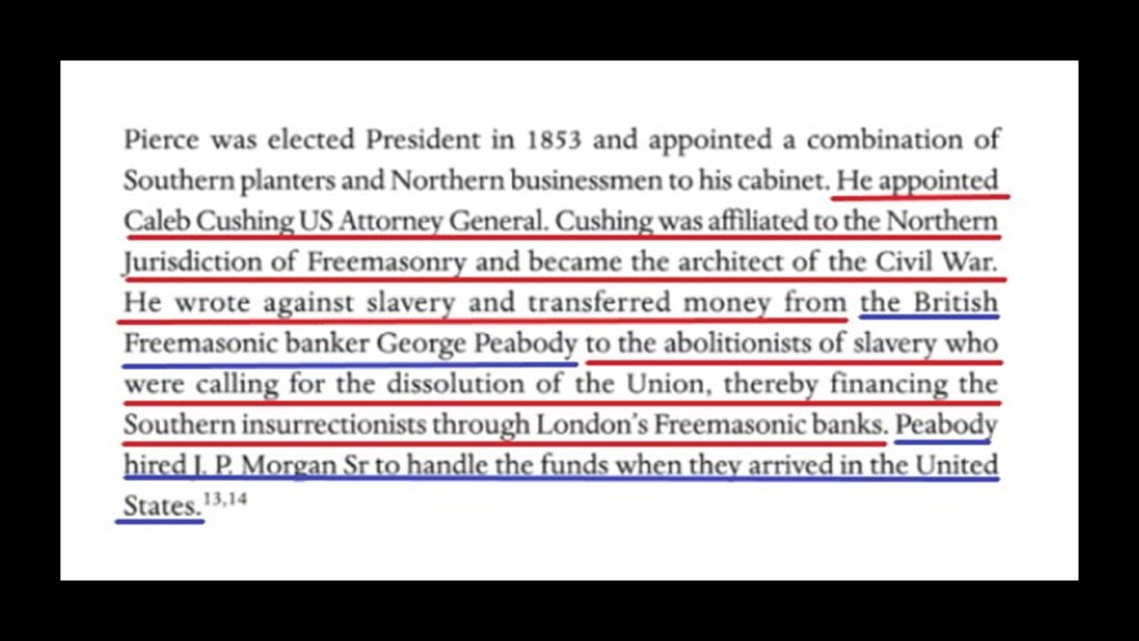 …George Peabody was the Freemasonic banker from whom money was transferred to the “southern insurrectionists,” and he hired the father of J. P. Morgan to handle the funds when they arrived in the United States.
