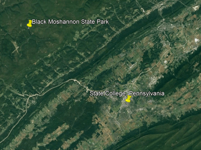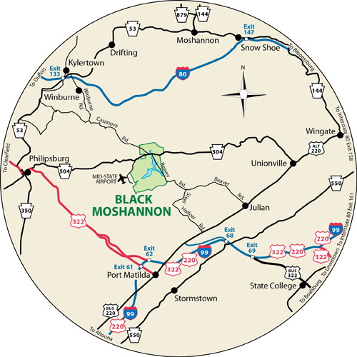 Black Moshannon State Park is is 9-miles, or 15-kilometers east of Phillipsburg on Pennsylvania Route 504.