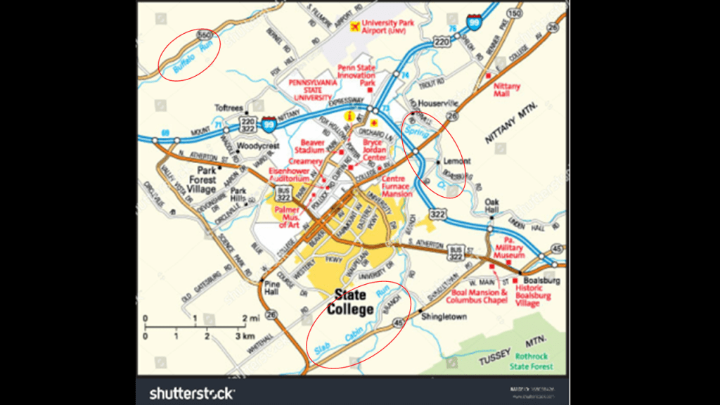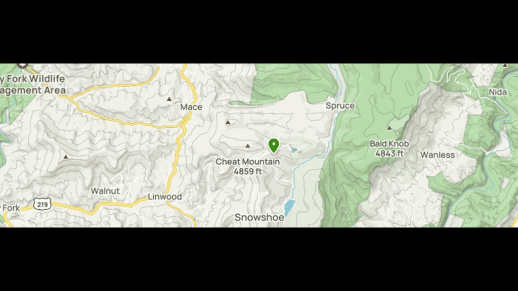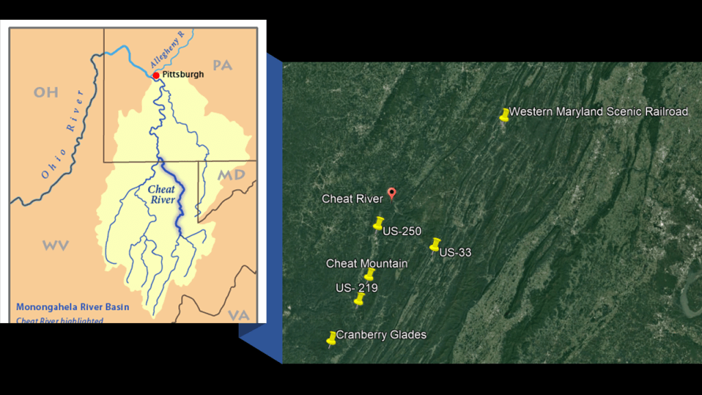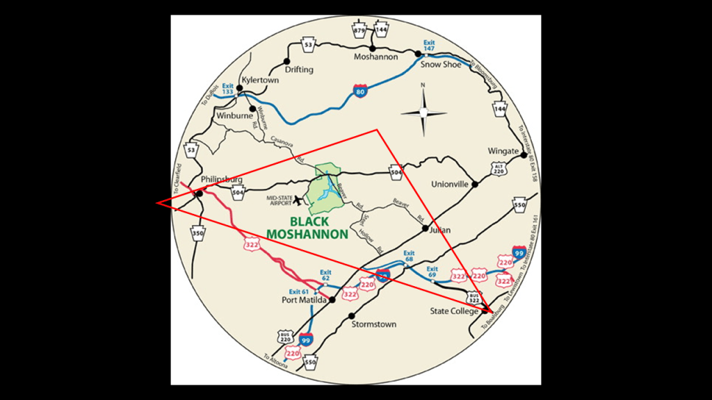 The “Snowshoe Rails to Trails” is near Philipsburg and Black Moshannon, and is seen here in the top-left-hand corner, right next to the Moshannon River where the arrows are pointing.