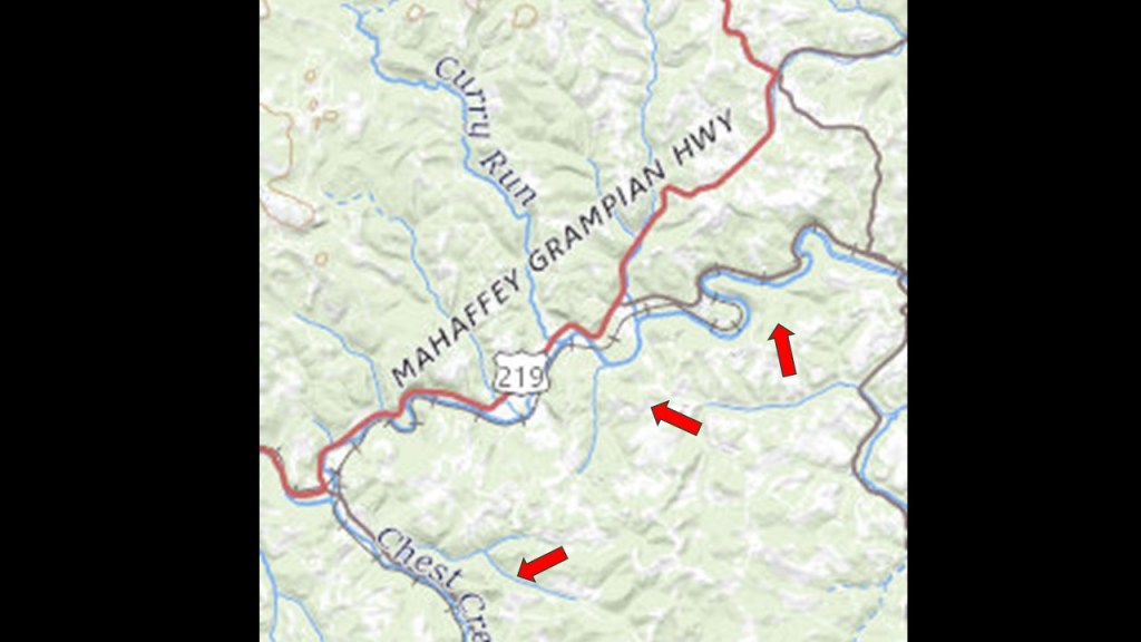 The arrows point to where railroad tracks ran along s-shaped river-bends. on this section of Route 219 going through Mahaffey Borough.