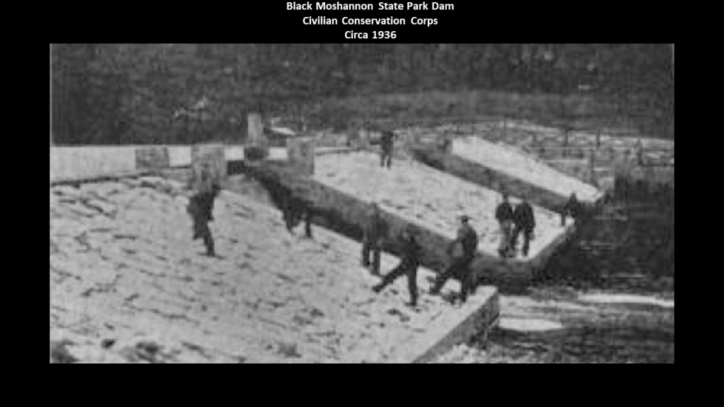The original dam here was said to have been constructed by William Parker as a splash dam for the movement of lumber after he leased lumbering rights at some point after lumber harvesting began here in 1794, and the CCC was said to have built the current dam there to replace it as part of the improvements the otherwise unemployed, unskilled young men made when they came to work on the park.