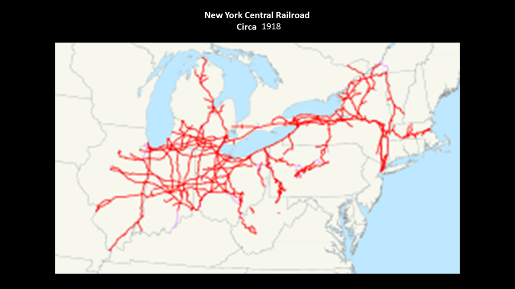 We are told extensive trackage existed in the states of New York, Pennsylvania, Ohio, Michigan, Indiana, Illinois, Massachusetts, and West Virginia, plus additional trackage in Ontario and Quebec, and by 1925 operated 26,395-miles, or 42,479-kilometers, of track.