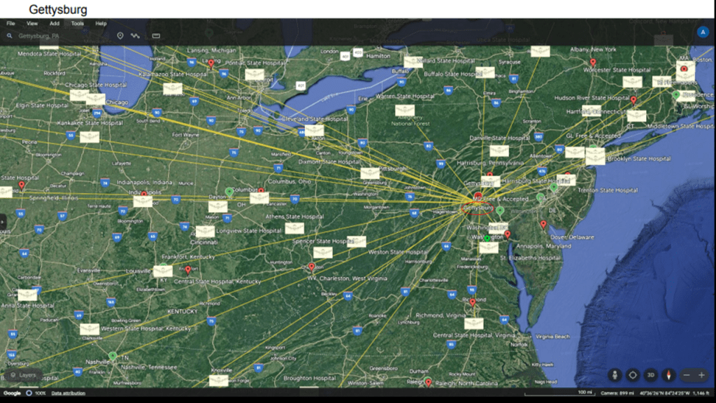 Gettysburg in Pennsylvania turned out to be a hub, circled in red, with many alignments between all three of these types of locations going out in all directions.