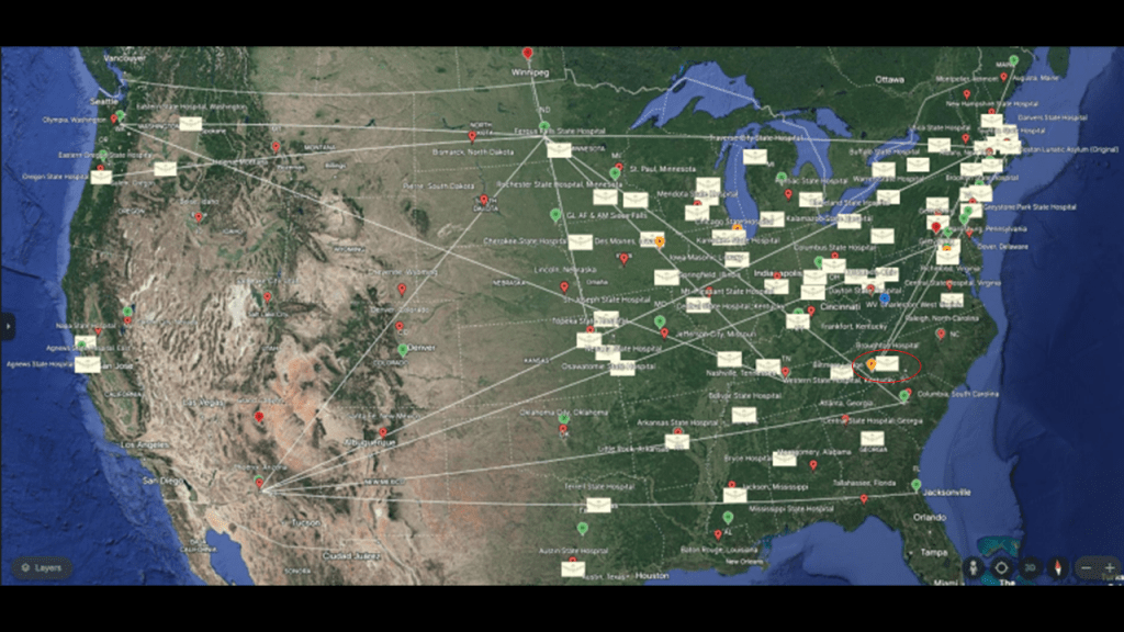 Aaron uncovered what I am going to share next when he was prompted to look into the relationship between the locations on Google Earth of Kirkbride buildings (marked by white), key masonic lodges (green), and state capitals (red).