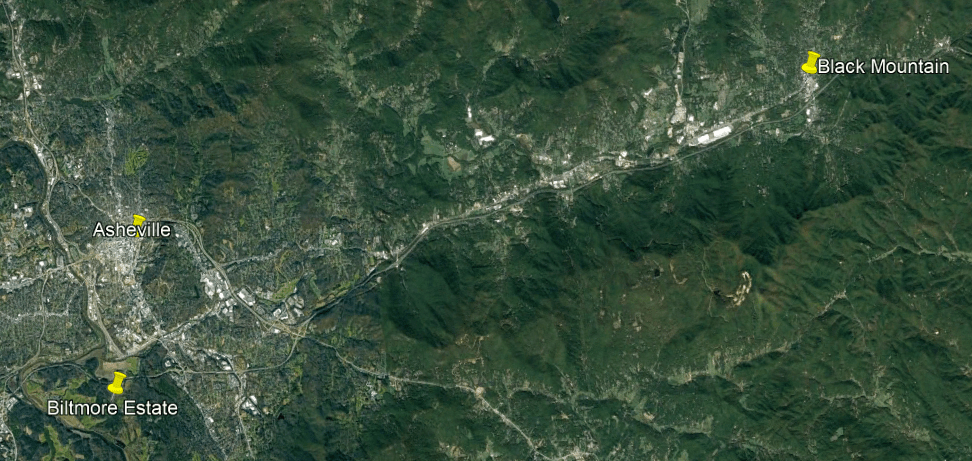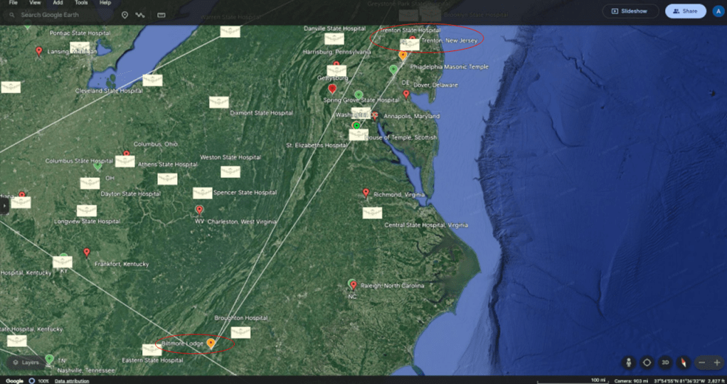 Here is a more localized view of alignments of Kirkbrides, masonic lodges and state capitals to the northeast of the Biltmore Lodge, and upon which the earlier Kirkbride example I gave of the Trenton State Hospital falls directly, circled at the top of the screenshot.