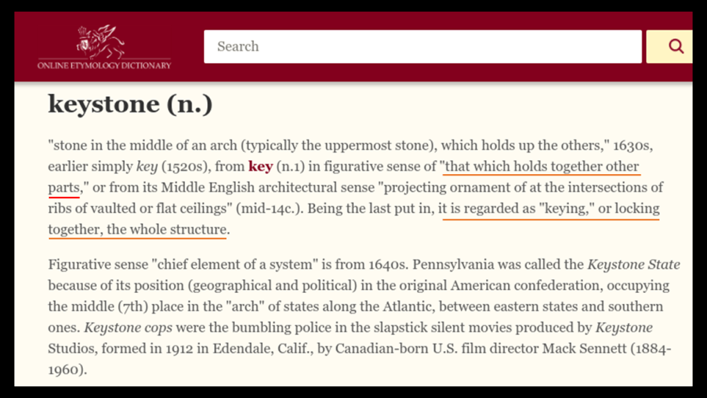 But another reason comes to mind in the definition of “keystone,” in its figurative sense as opposed to its literal meaning as the stone in the middle of the arch which holds up the others.”