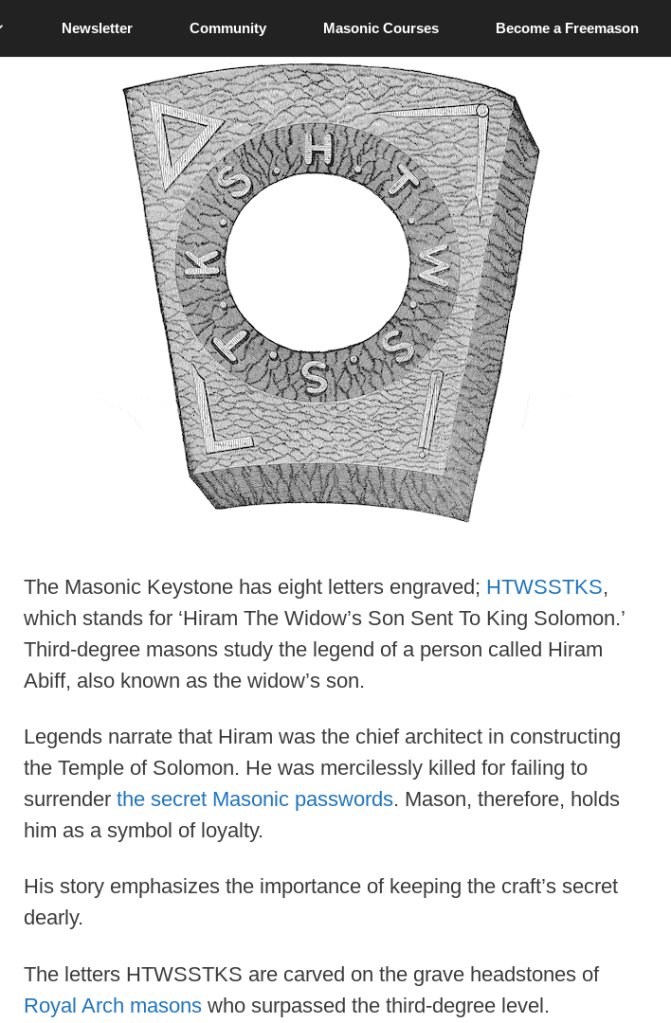 Additionally, the story of the Masonic Keystone is well-worth looking at. which has the letters “HTWSSTKS” engraved on it, said to mean “Hiram The Widows Son Sent To King Solomon,” referring to Hiram Abiff.
