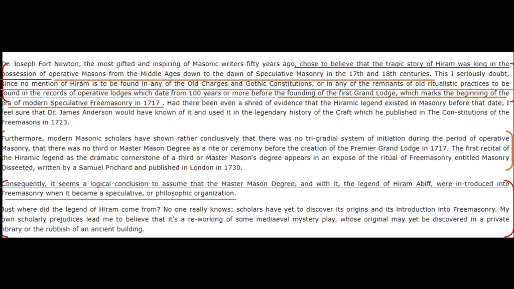 In it, the writer talks about “Operative Masonry” and the beginning of “Speculative Masonry” in 1717, with the founding of the Premier Grand Lodge of England.”