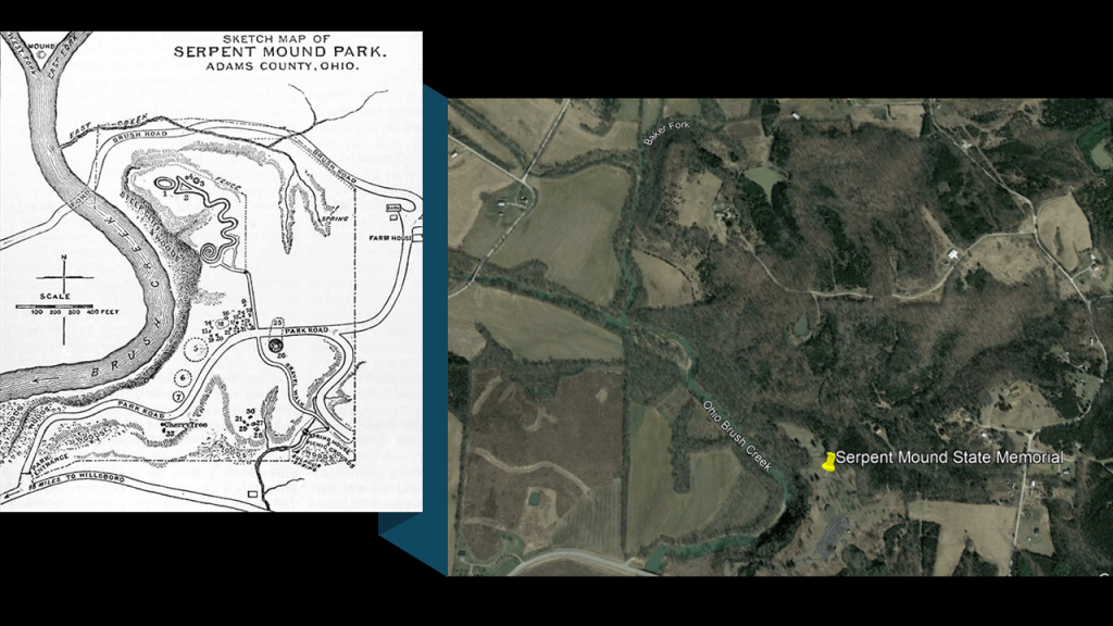 It shows the proximity of the Great Serpent Mound to the s-shaped bends of Brush Creek, and its nearby confluences/junctions with other watercourses, compared with the Google Earth Screenshot of the location on the right.