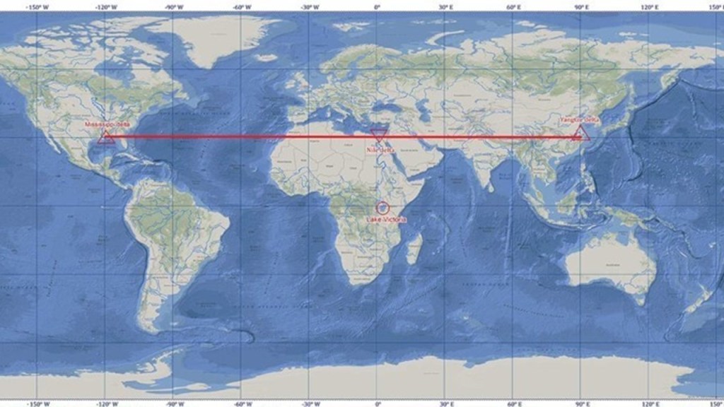 As a matter of fact, the Mississippi River Delta, Nile River Delta, and Yangtze River Delta are in linear alignment with respect to each other, straight across the 30-degree north parallel.