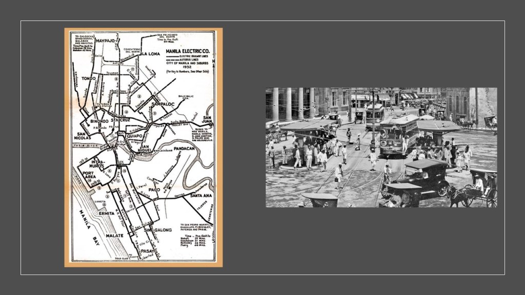 There was a streetcar system in Manila, called the Tranvias, construction of which was said to have been started in 1878, with the first line opening in 1882. This postcard was circa 1900, showing the contrast of the electric streetcar with the horse-drawn carriages.